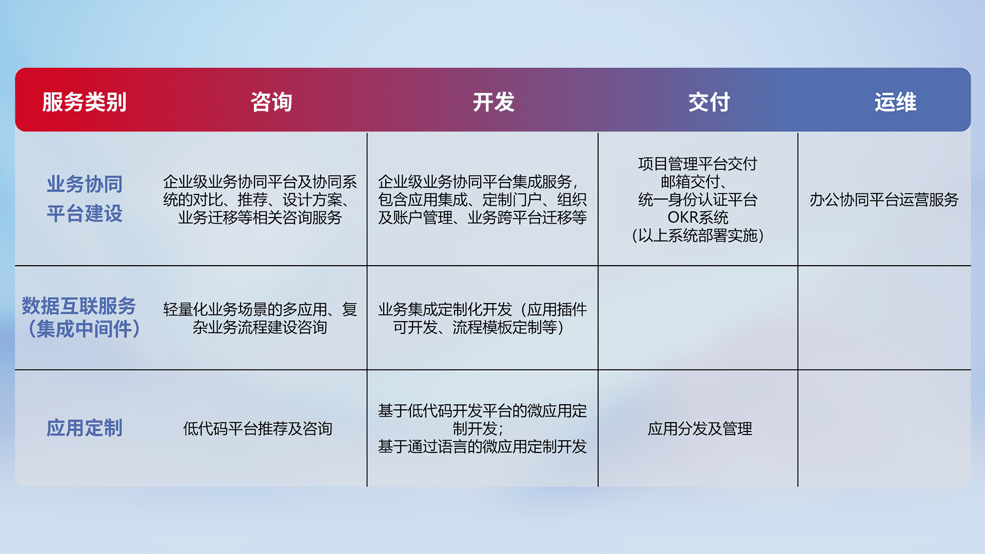 针对钉钉、、、、企微、、、、IDaas等平台级产品提供产品的规划、、、方案、、交付、、、、定制化开发等服务,,,实现如统一协同办公、、、、智能客户服务、、、混合会议管理、、、、智能数据查询、、、等业务场景,,实现数字化转型。。。。
