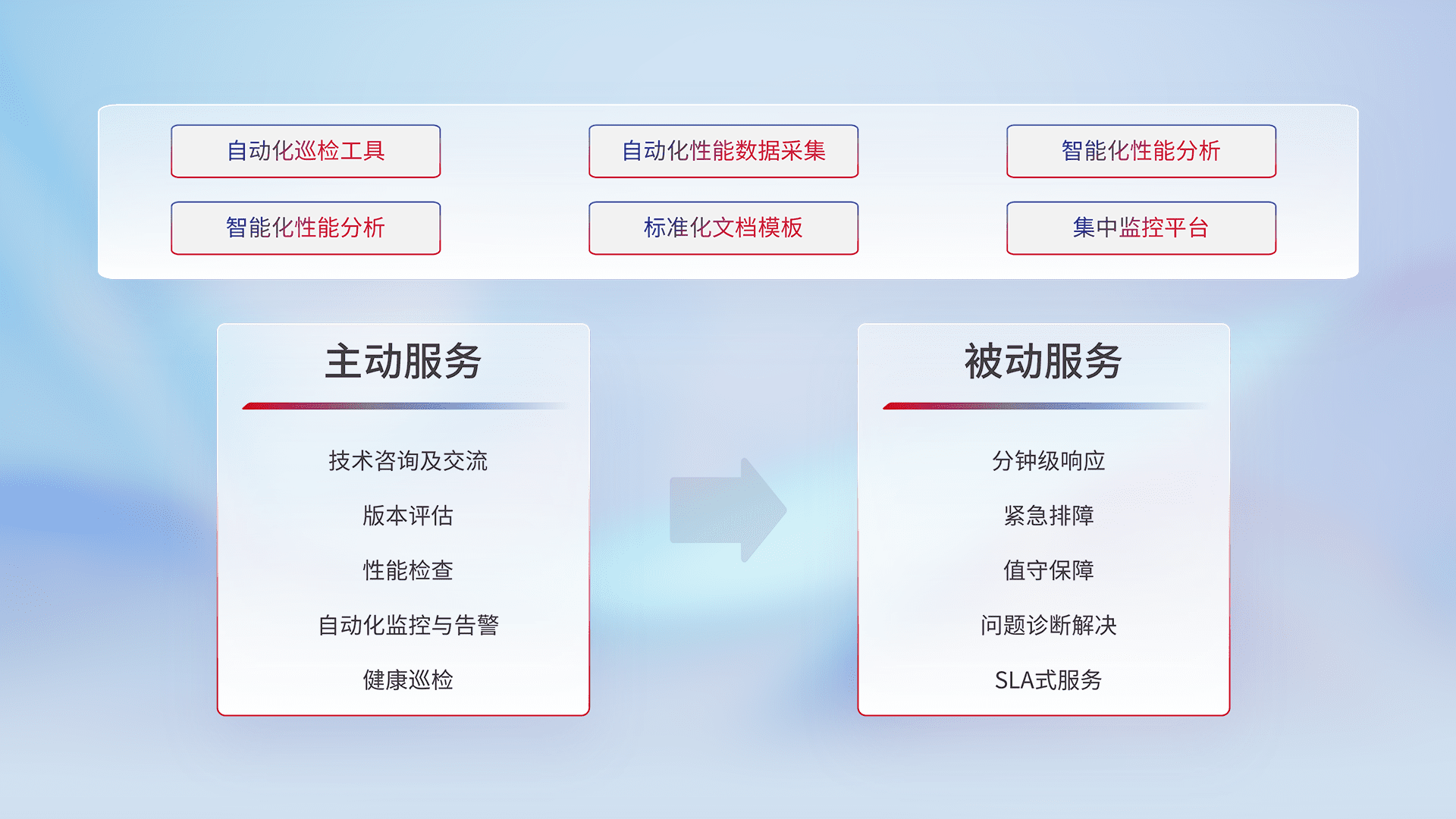 智能化工具和标准化文档,,,,保障服务质量,,提供主动服务(包含技术咨询、、版本评估、、性能检查、、自动化监控与告警、、、健康巡检)和被动服务包含(分钟级响应、、紧急排障、、、、值守保障、、、问题诊断解决、、、、SLA服务)。。。