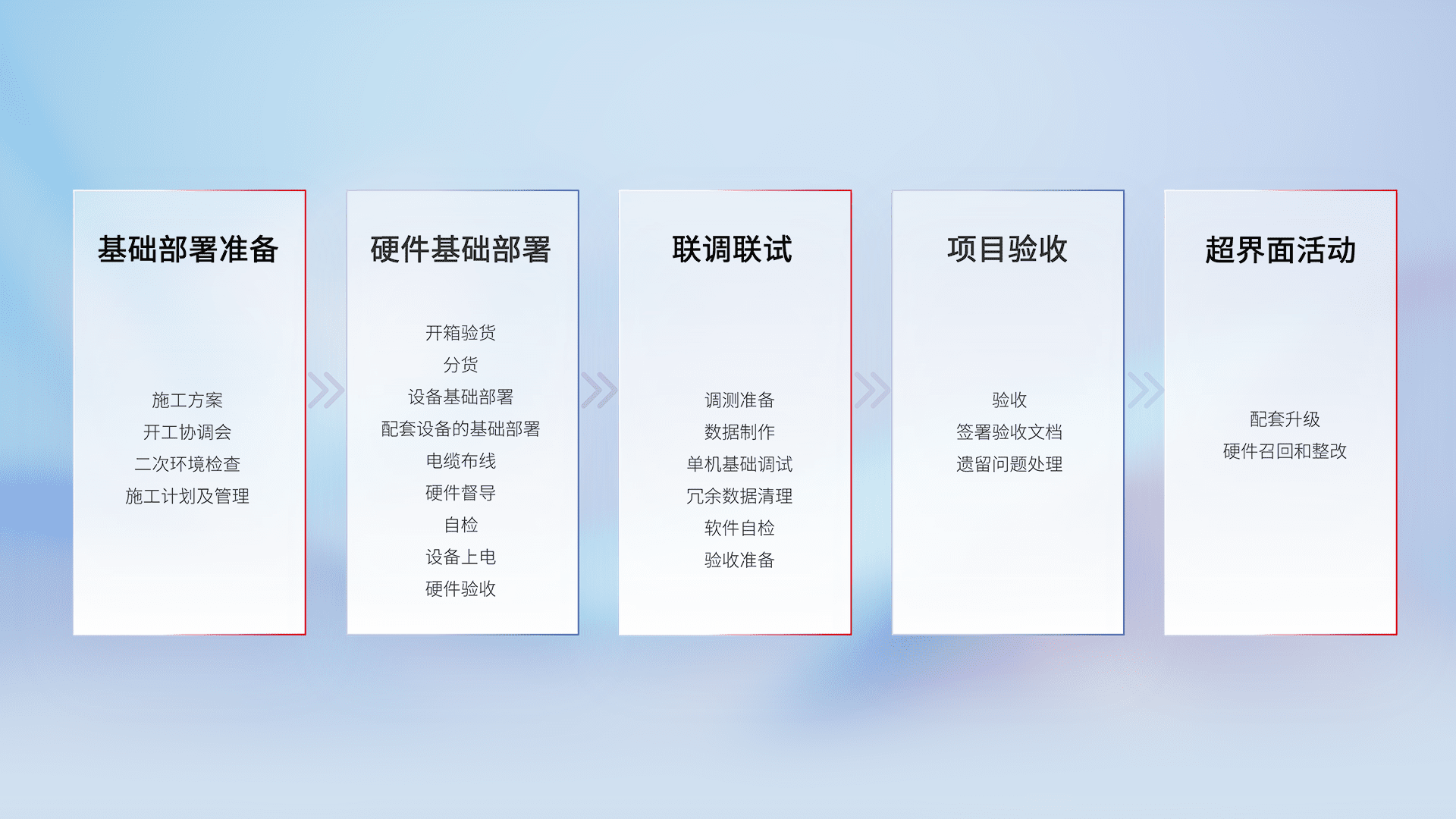 从基础部署准备、、硬件基础部署、、、联调联试、、项目验收、、、越界面活动的全过程可追溯,,,保证施工质量和进度。。。。